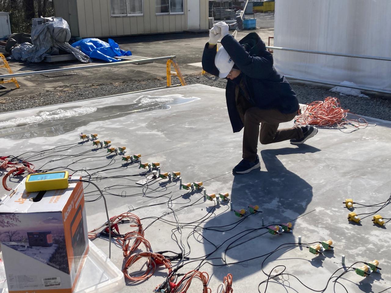 実験場のコンクリートブロックには雪も残っており、前日の寒さがうかがえます。
